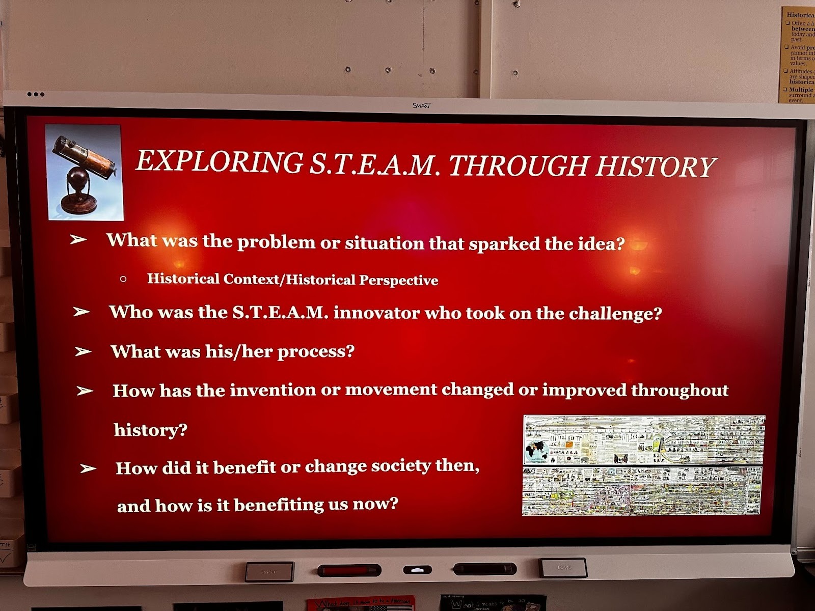 One of my favorite ways to integrate S.T.E.A.M. into social studies is our “Exploring S.T.E.A.M. Through History” project. In this project, students investigate an obscure or lesser-known innovation, not the usual telescope, steam engine, or telephone, and trace its impact from the past to the present.